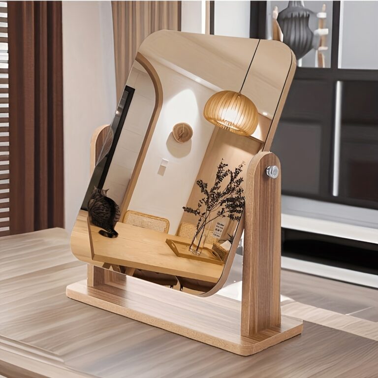 1pc Rotating Wooden Makeup Mirror with Tabletop Stand – Portable HD Vanity Mirror for Dressing, Polished Finish, Cartoon Theme, Unscented, No Battery Required