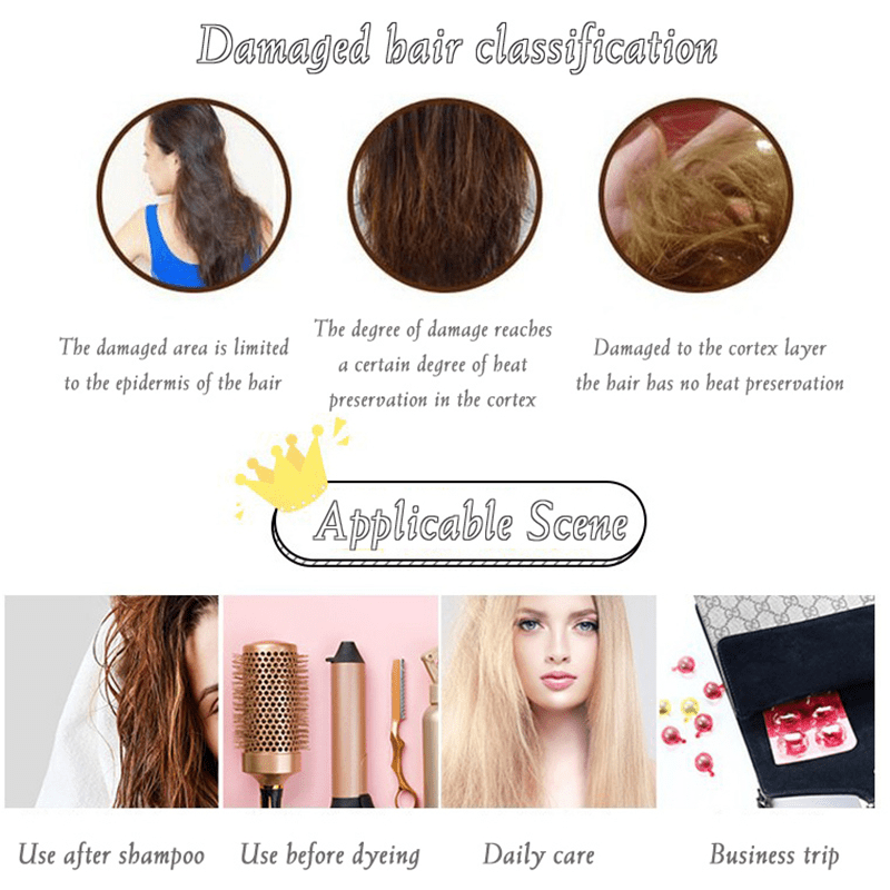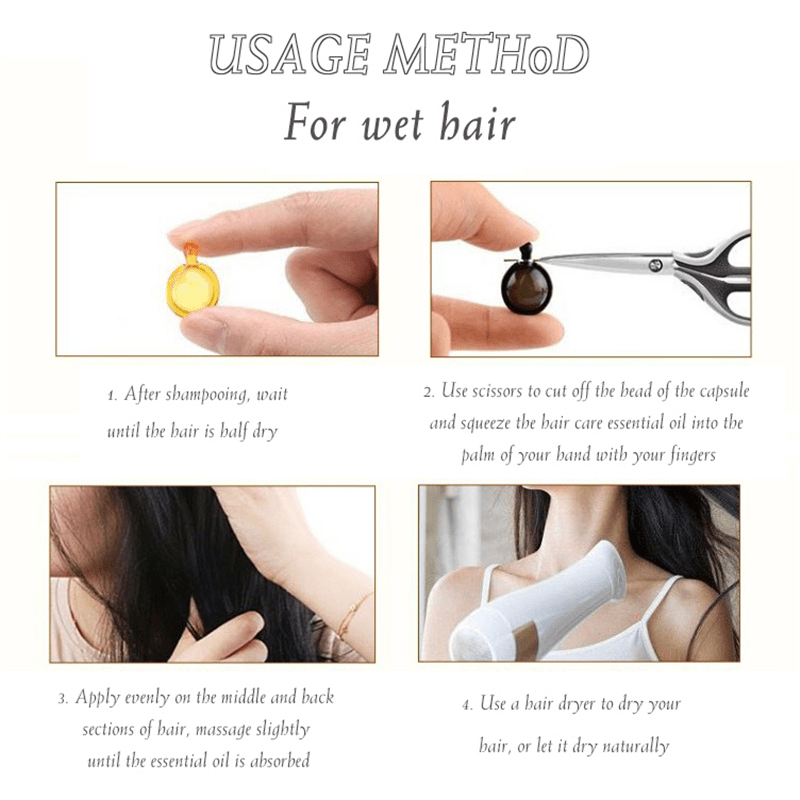 Product weight: 1g Expiration date: 3 years Purpose: Revitalize hair Country of origin: Manufactured in China Instructions: For damp hair 1. After washing hair, wait until it is partially dry 2. Cut the tip of the capsule with scissors and squeeze the hair treatment oil onto your palm using your fingers 3. Apply evenly to the mid and lower sections of the hair, gently massage until the oil is absorbed 4. Blow dry or air dry your hair For dry hair: