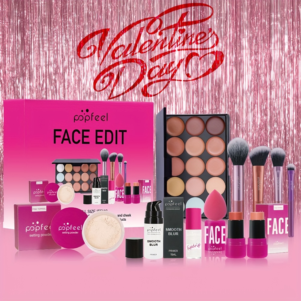 11pcs POPPEL FACE EDIT Makeup Kit – Complete Cosmetic Set with Eyes, Lips & Face Products, Including Foundation, Blush, Eyeshadow Palette, Lipstick, Mascara, Brushes & Sponge – Ideal Valentine’s Gift for Girlfriend, Makeup Accessories