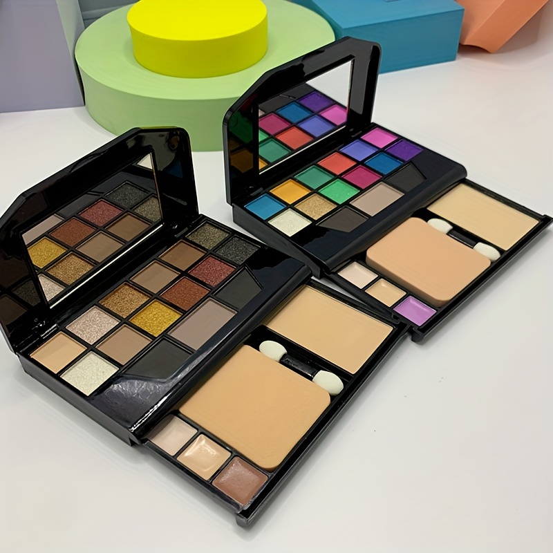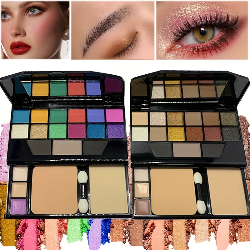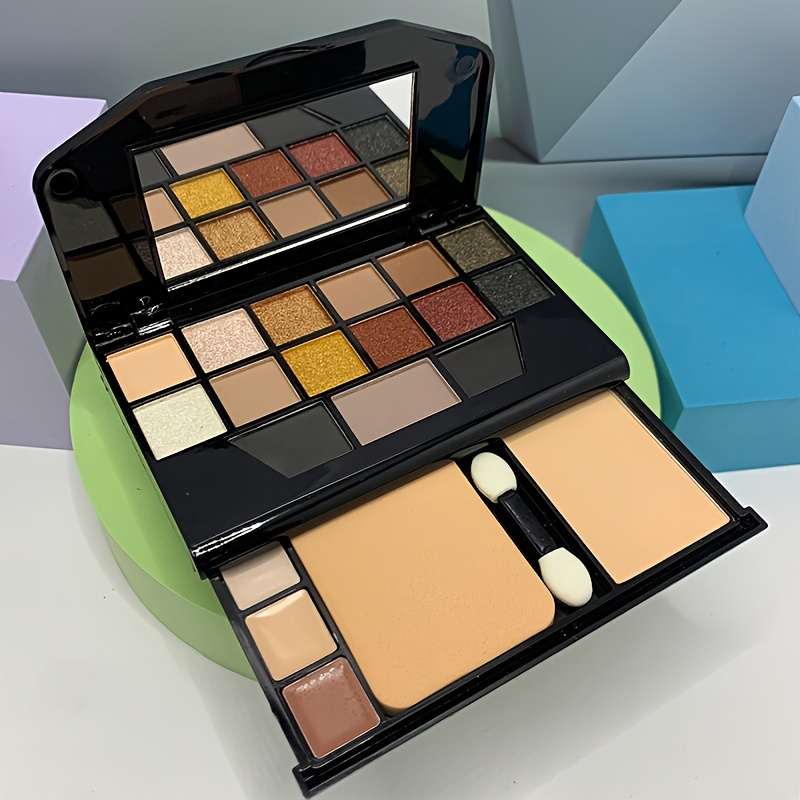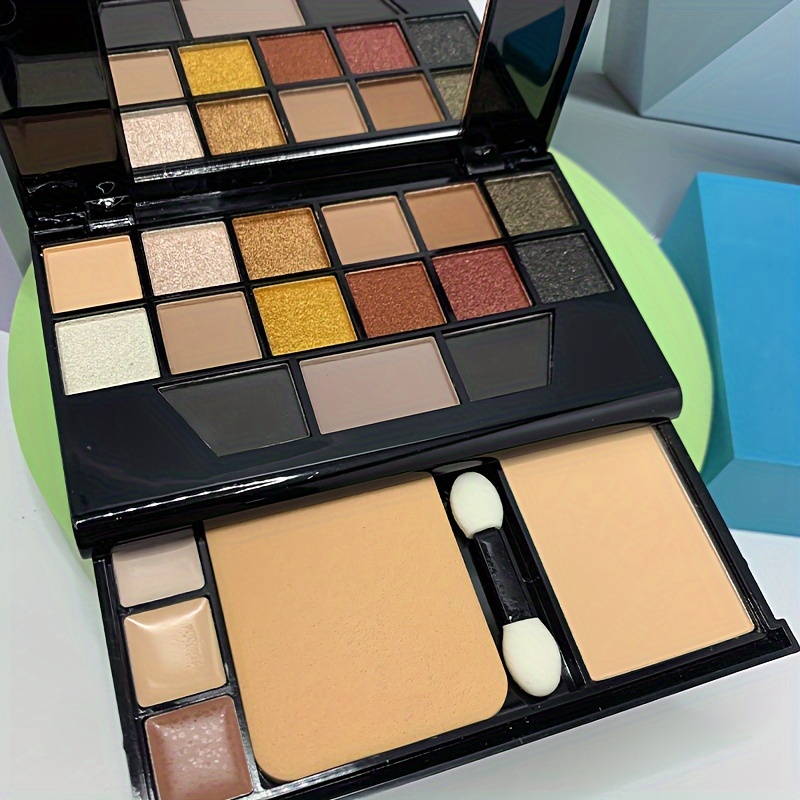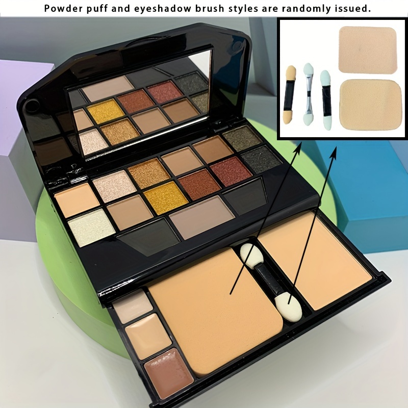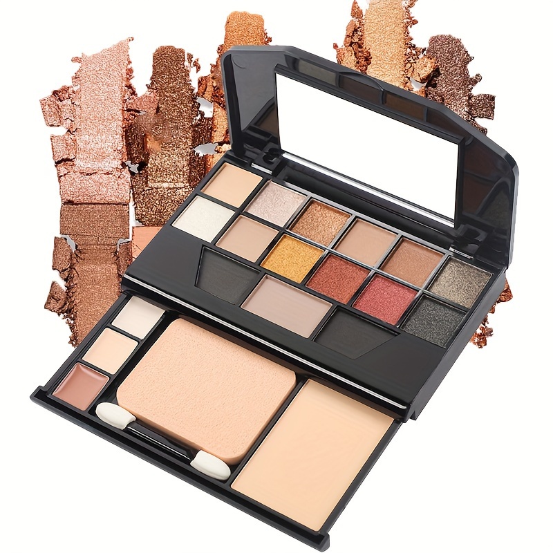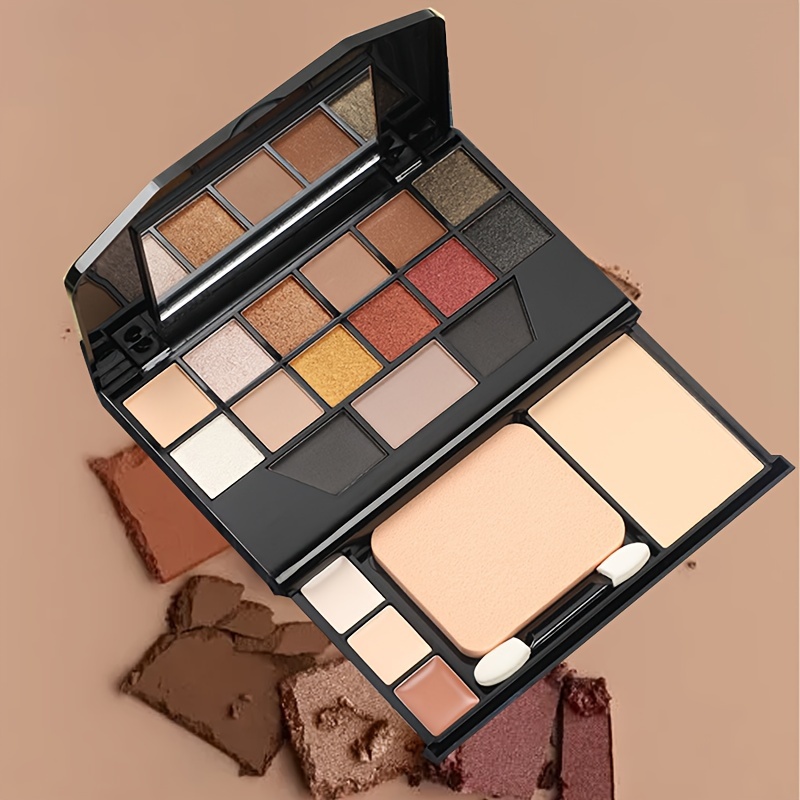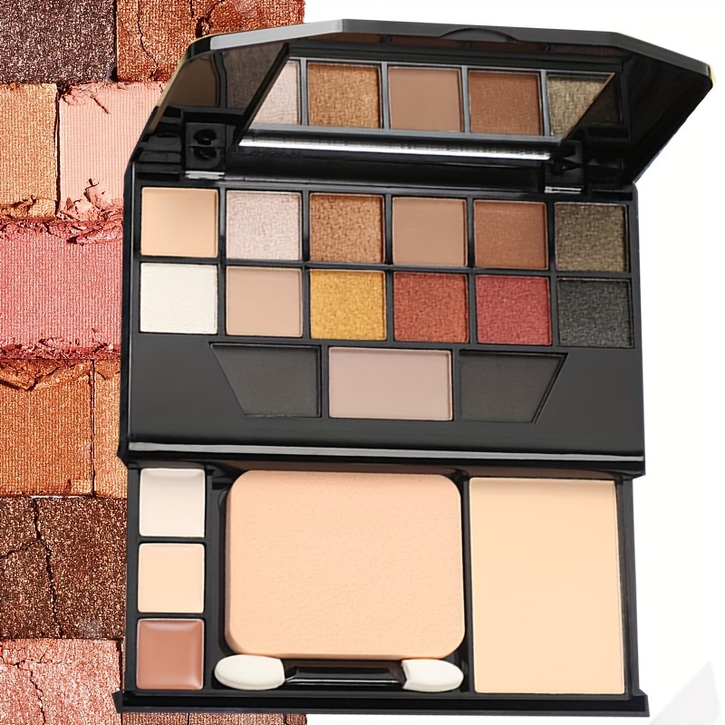 19-Color Multifunctional Makeup Palette with 12 Eyeshadow Shades, Eyebrow Powder, Contour, Concealer, Foundation, Puff & Eyeshadow Stick, Compact Travel Cosmetic Kit, Powder Form, Mixed Brown Tones