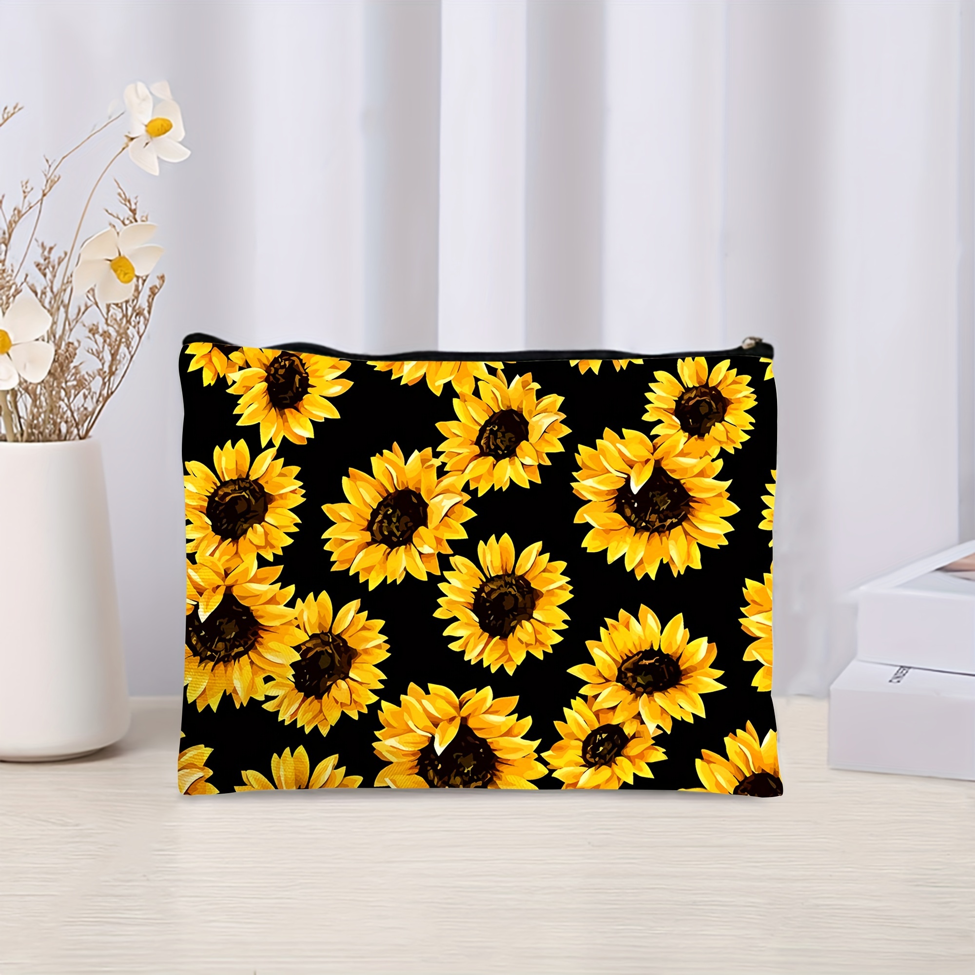 1pc Sunflower Cosmetic Pouch, Yellow Zippered Canvas