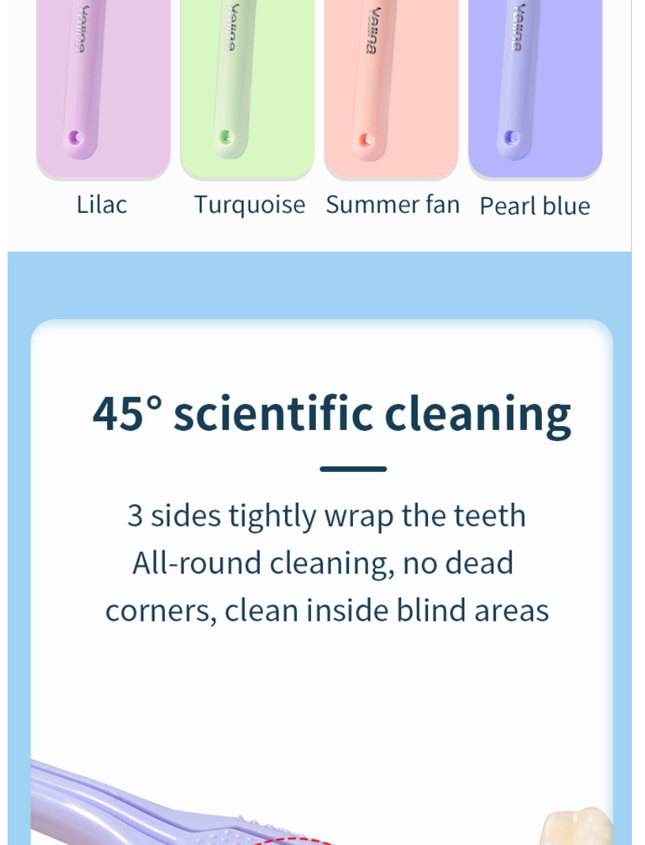 3. The scientific 45-degree inclination allows the toothbrush to thoroughly and thoroughly clean the food residues in the gaps between the teeth and gums, reducing the risk of tooth decay and protecting the health of teeth.