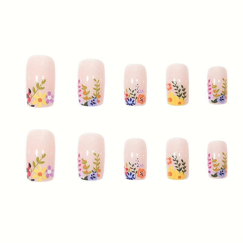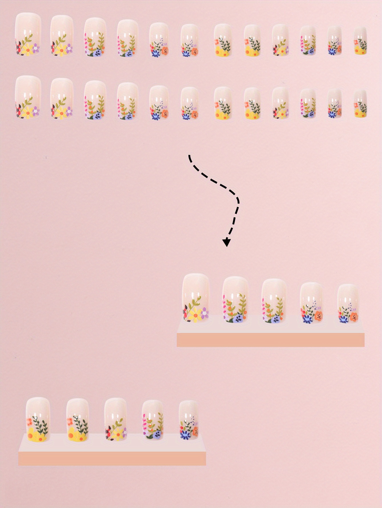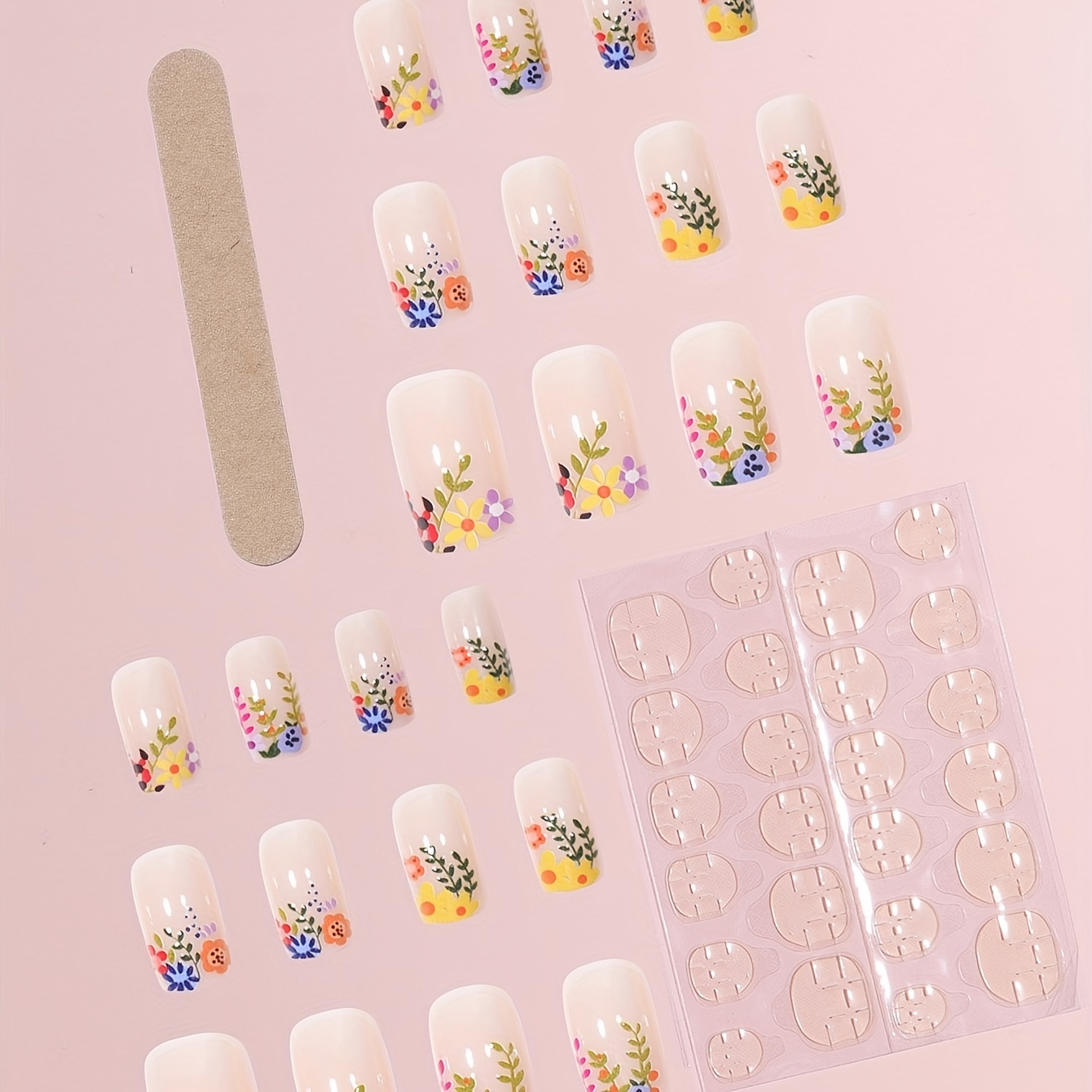 24pcs Medium Size Coffin Flower Pattern ABS Full Cover Glossy False Nails & 1 Nail File and 1 Tape