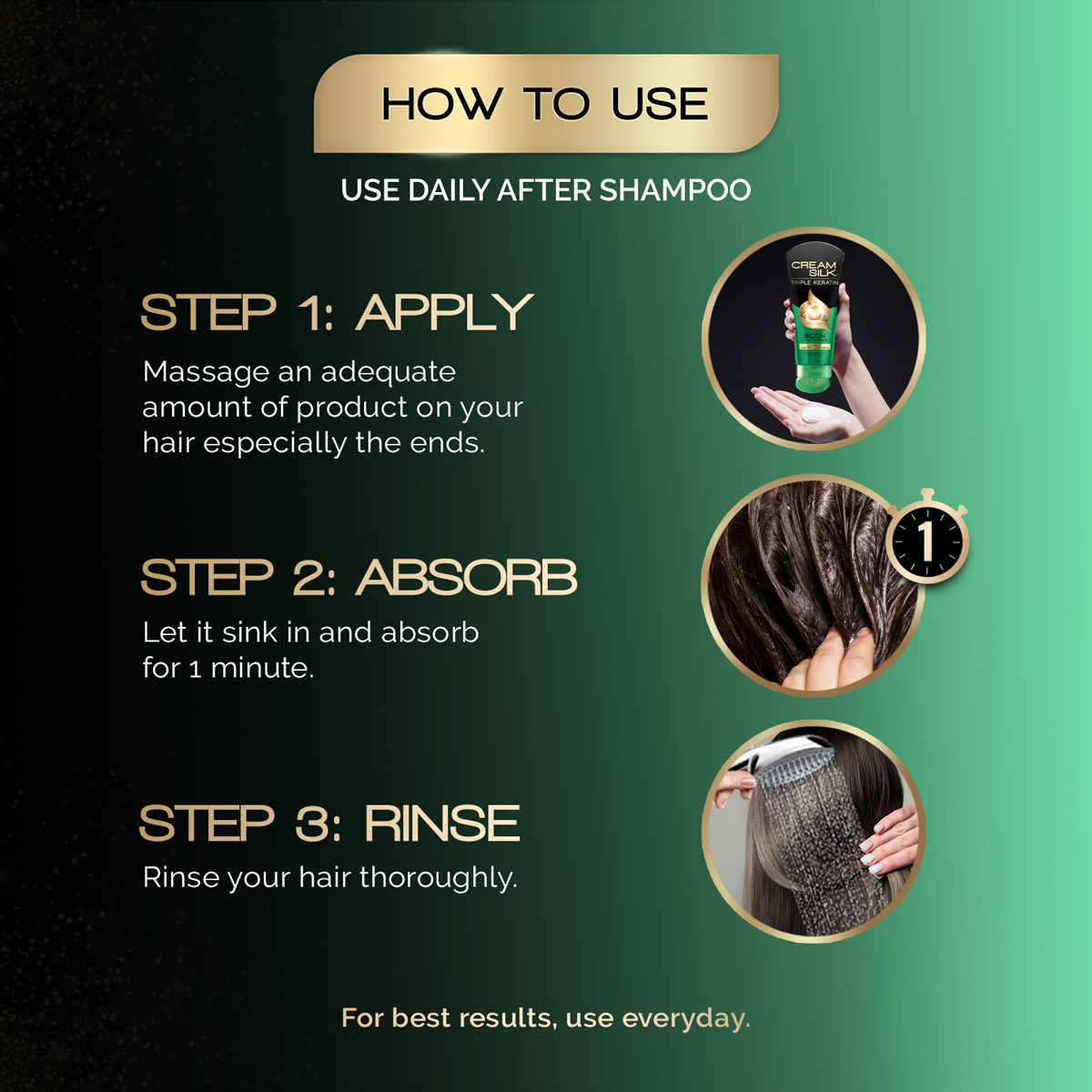 Cream Silk’s most advanced anti-hair fall 3-in-1 conditioning system that gives the benefits of 3 Keratin products in 1 ultimate solution. It reduces hair fall and strengthens weakened hair strands from inside out for strong hair that’s ultimately break-resistant.