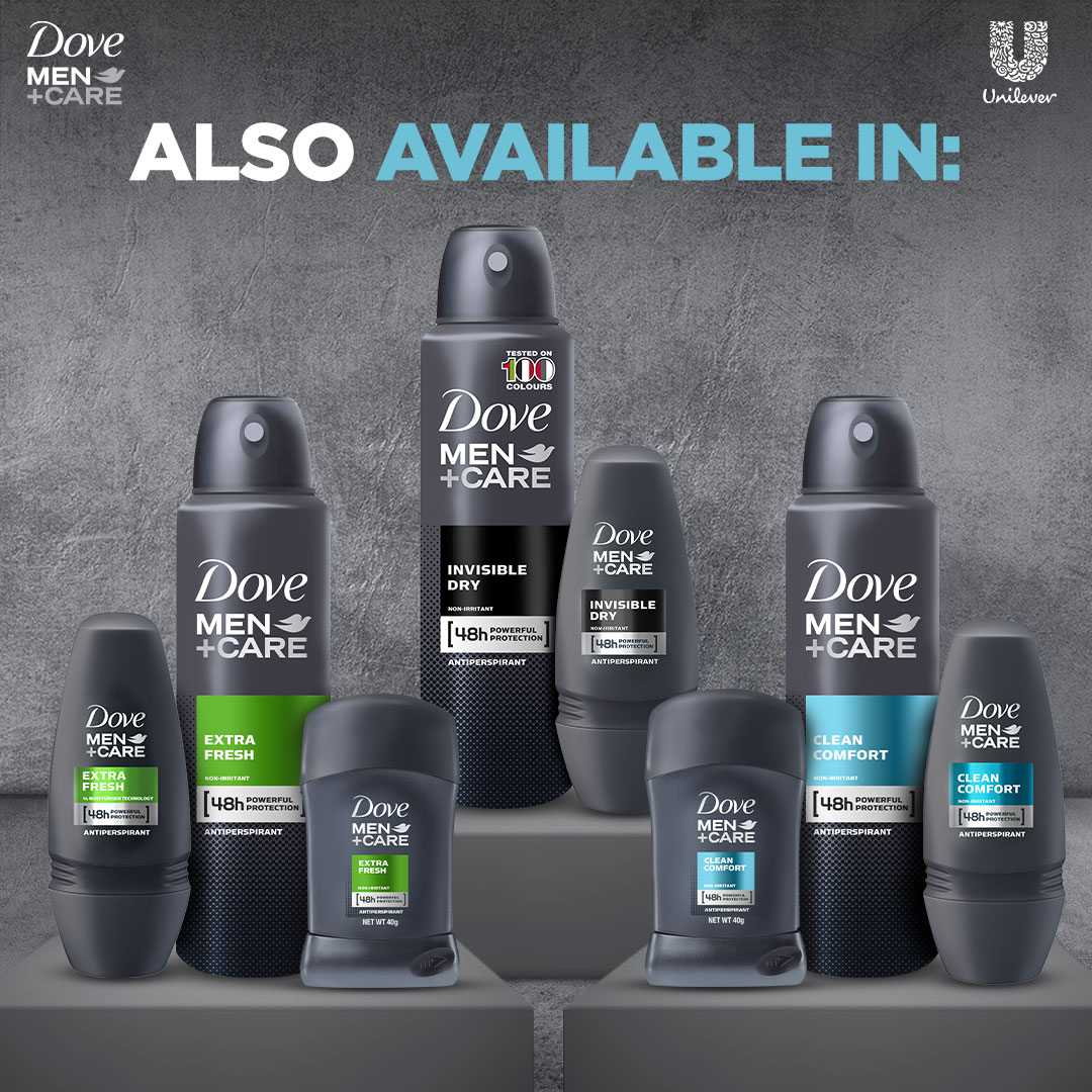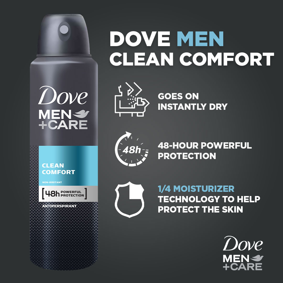 • Dove Men+Care Clean Comfort is tough on sweat, but not on skin. With a clinically proven non-irritant formula and Dove’s signature ¼ moisturizing cream. Stay dry with a cleaner feel.