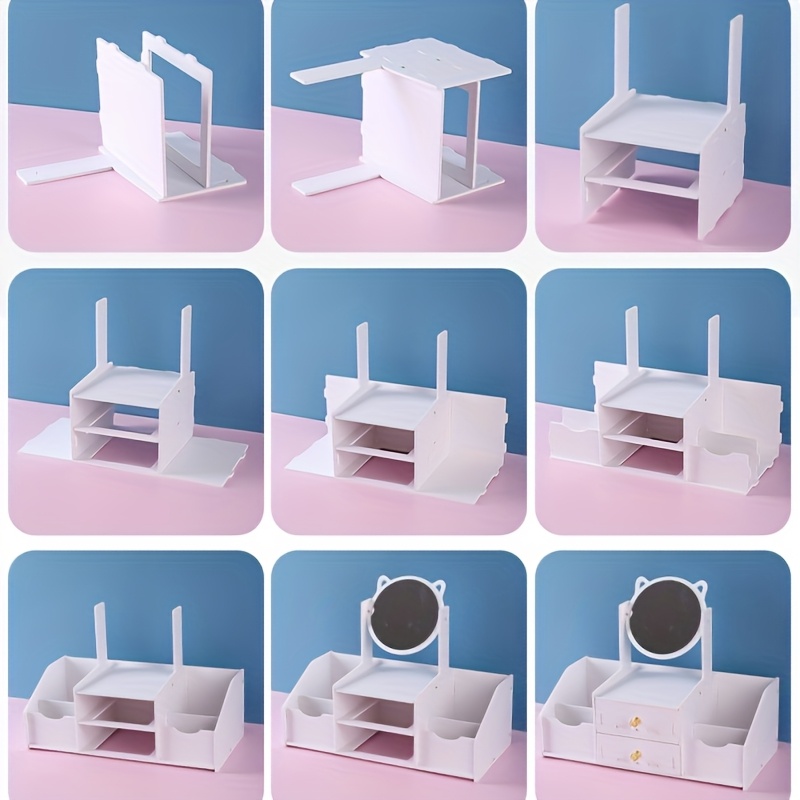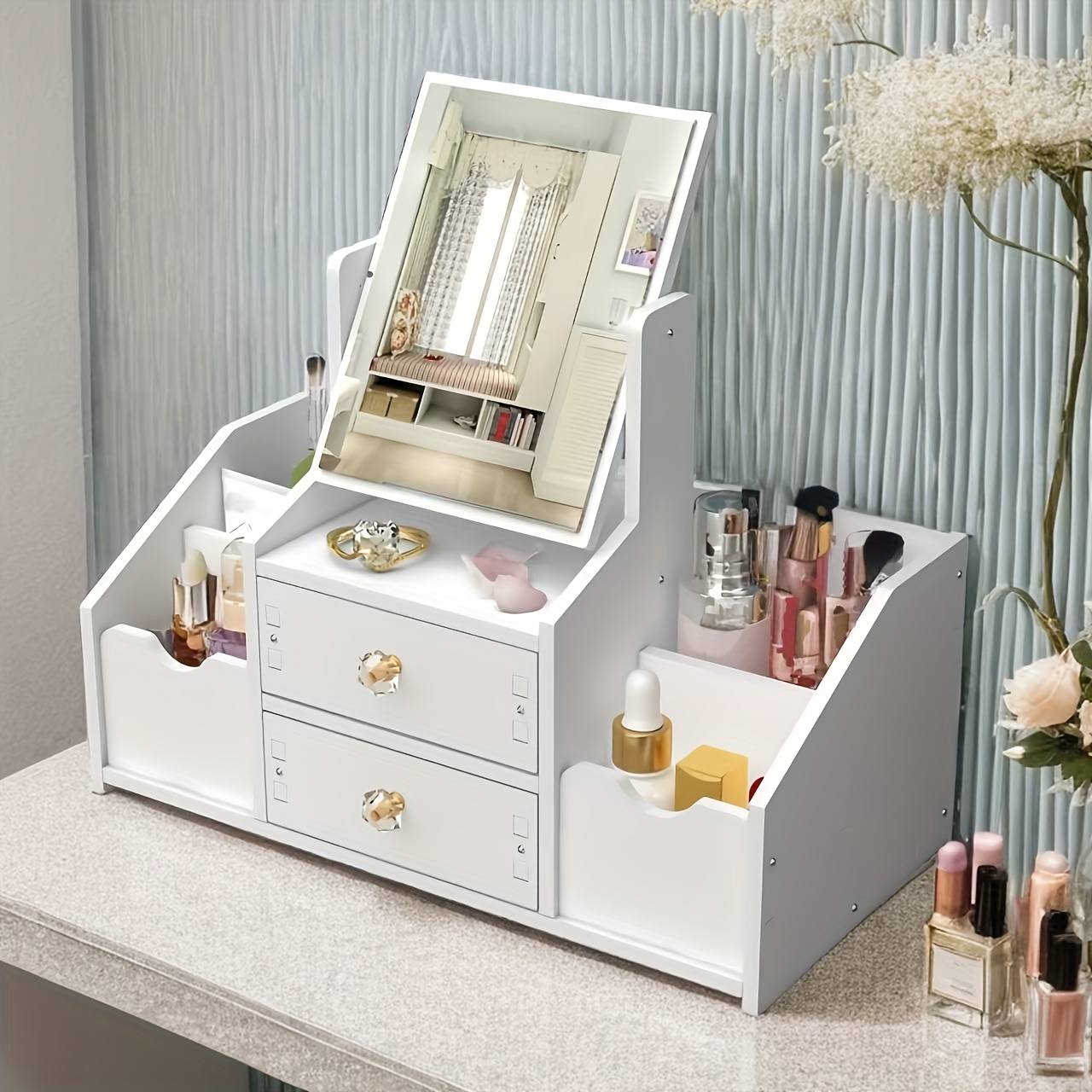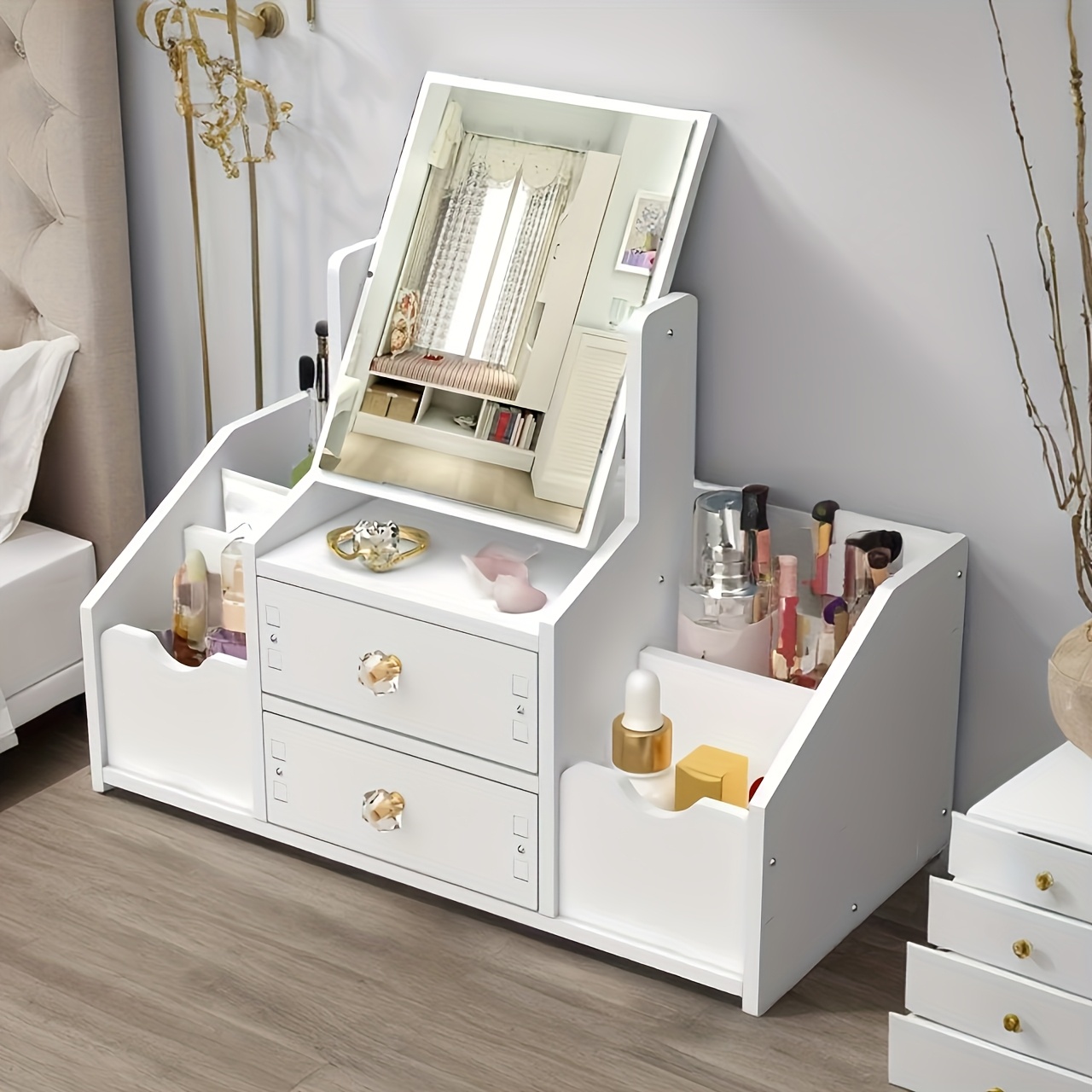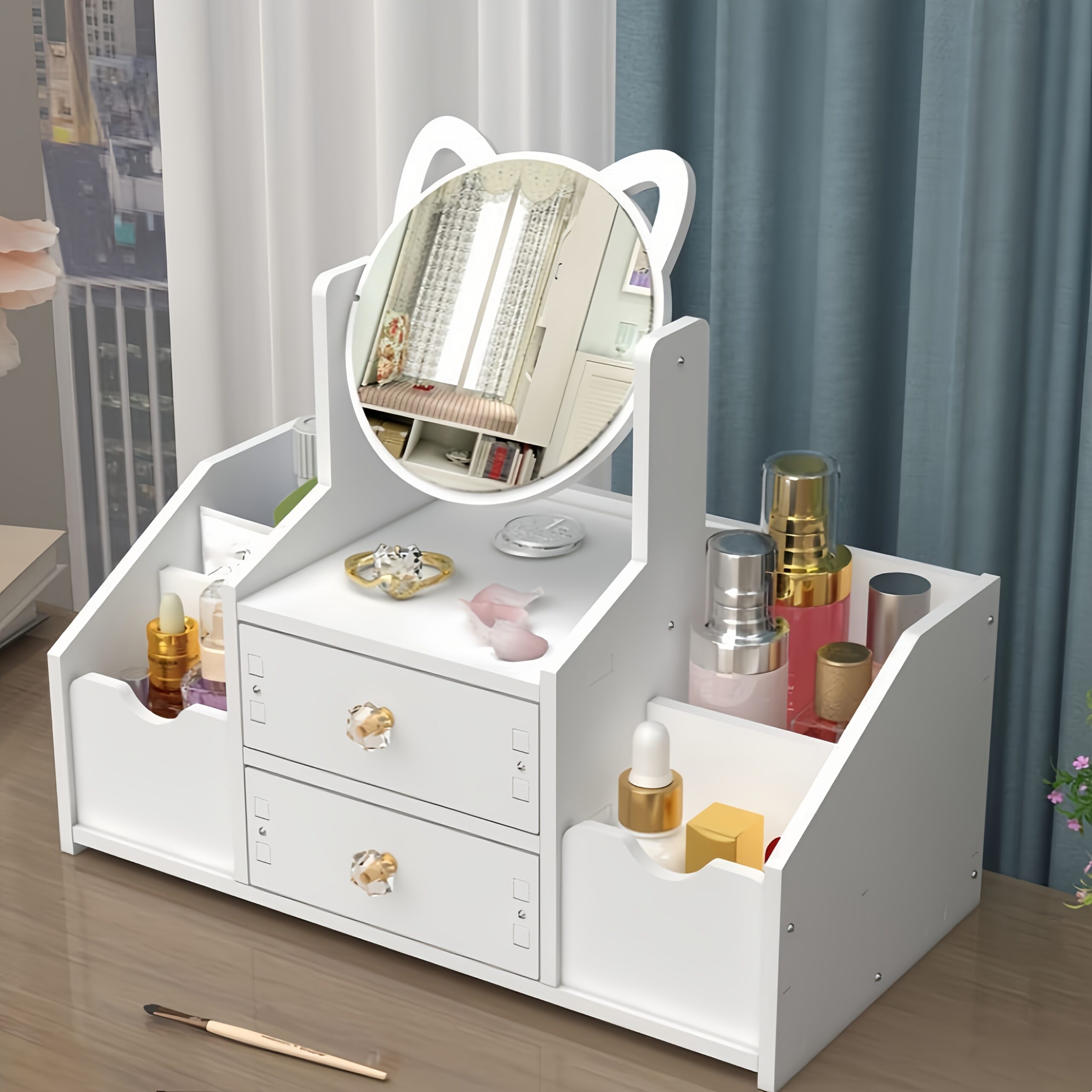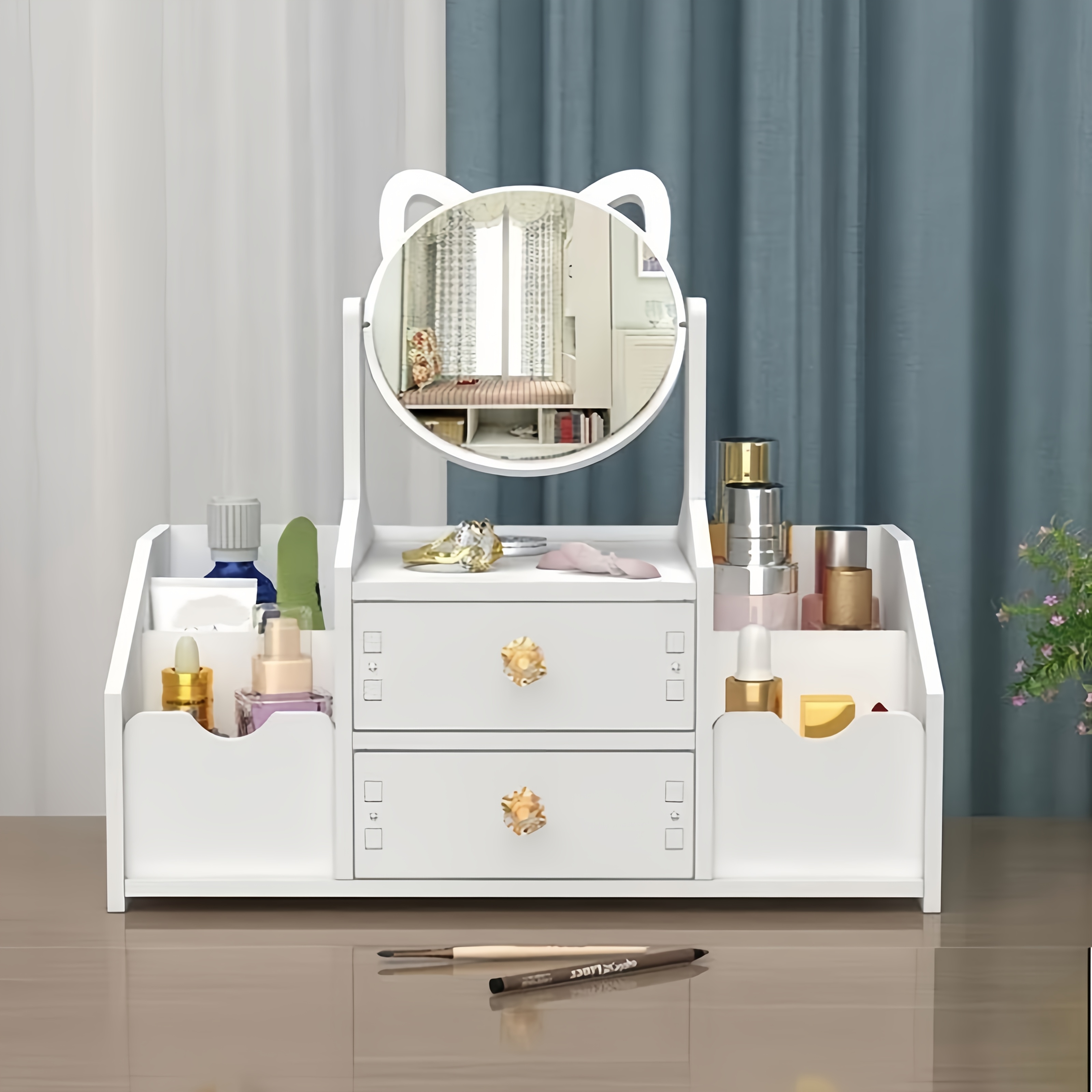 Elegant White Cat-Themed Makeup Organizer with Mirror & Drawers – Dustproof Wooden Cosmetic Storage Box for Skincare & Jewelry, 360° Rotating Design, No Electricity Required, Perfect for Vanity Display
