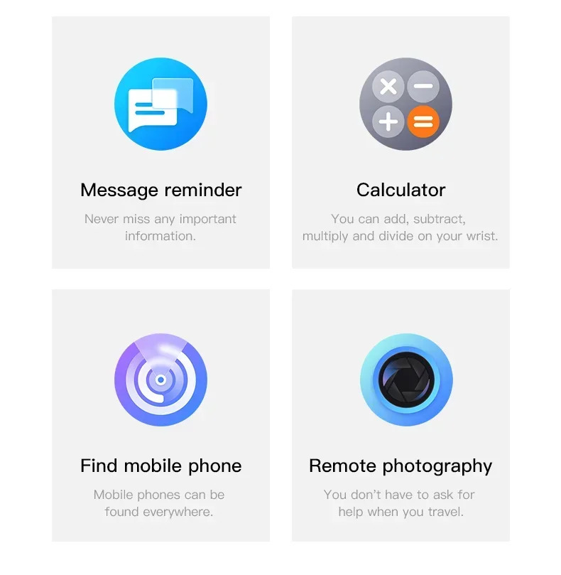 5.Other functions:Turn the wrist to brighten the screen, low power mode, silent mode, anti-lost, control photo, music control, stopwatch, alarm clock, calendar, calculator tebaurry.