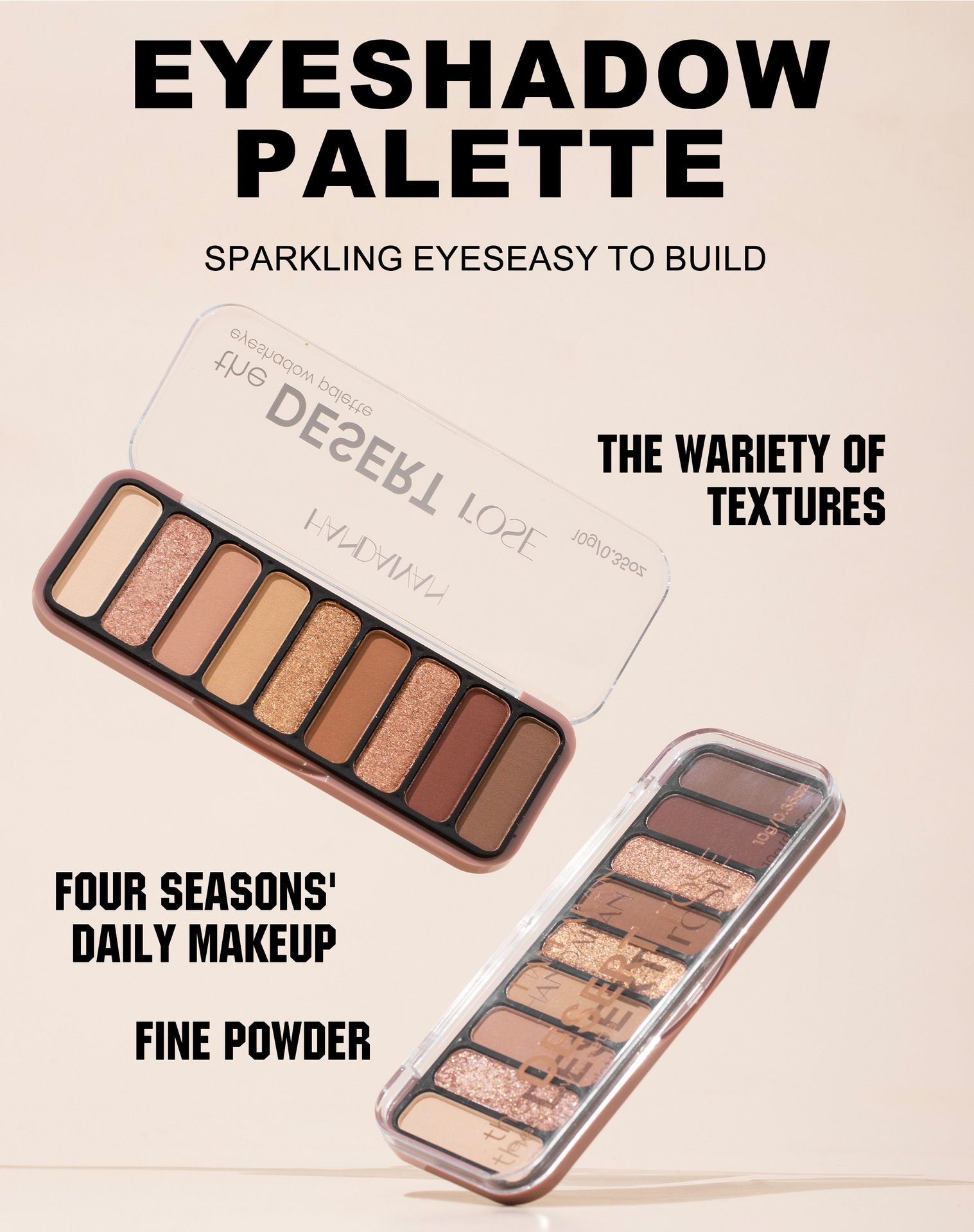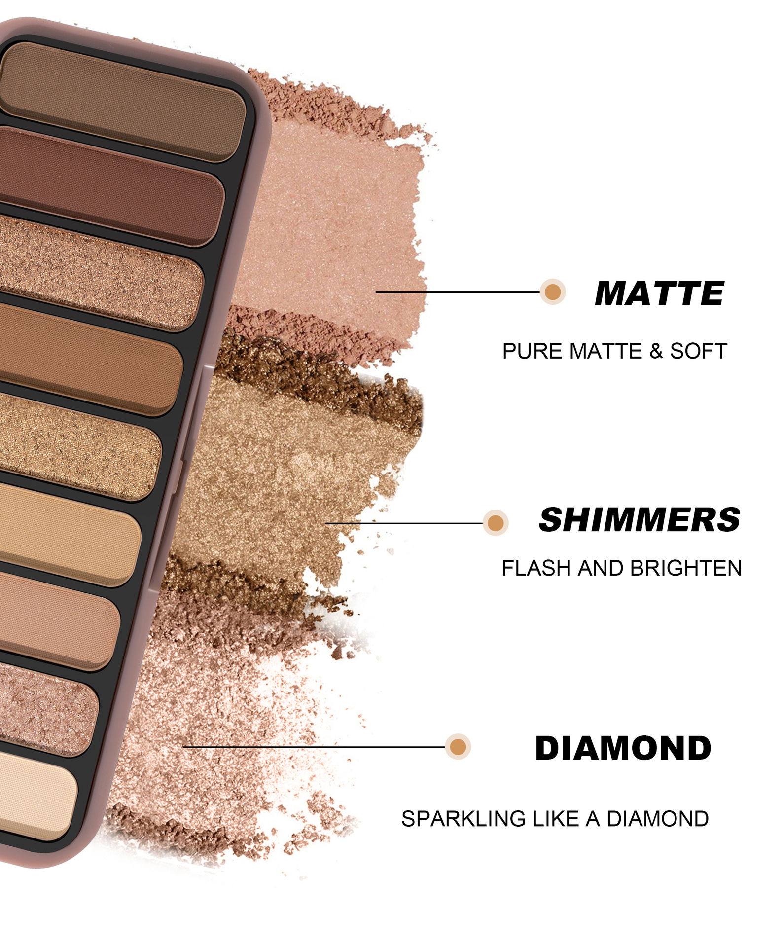 - Texture: Pearlescent, Powdered, Matte, Thin and Glittering