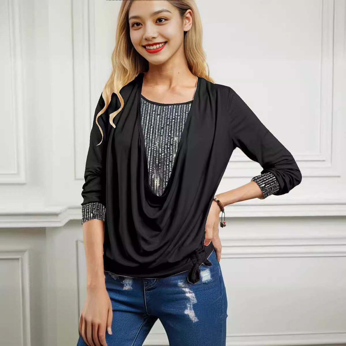 Long Sleeve Women’s Clothing Large Drop Neck Loose Ruched Two-Piece Fashion Ladies Top