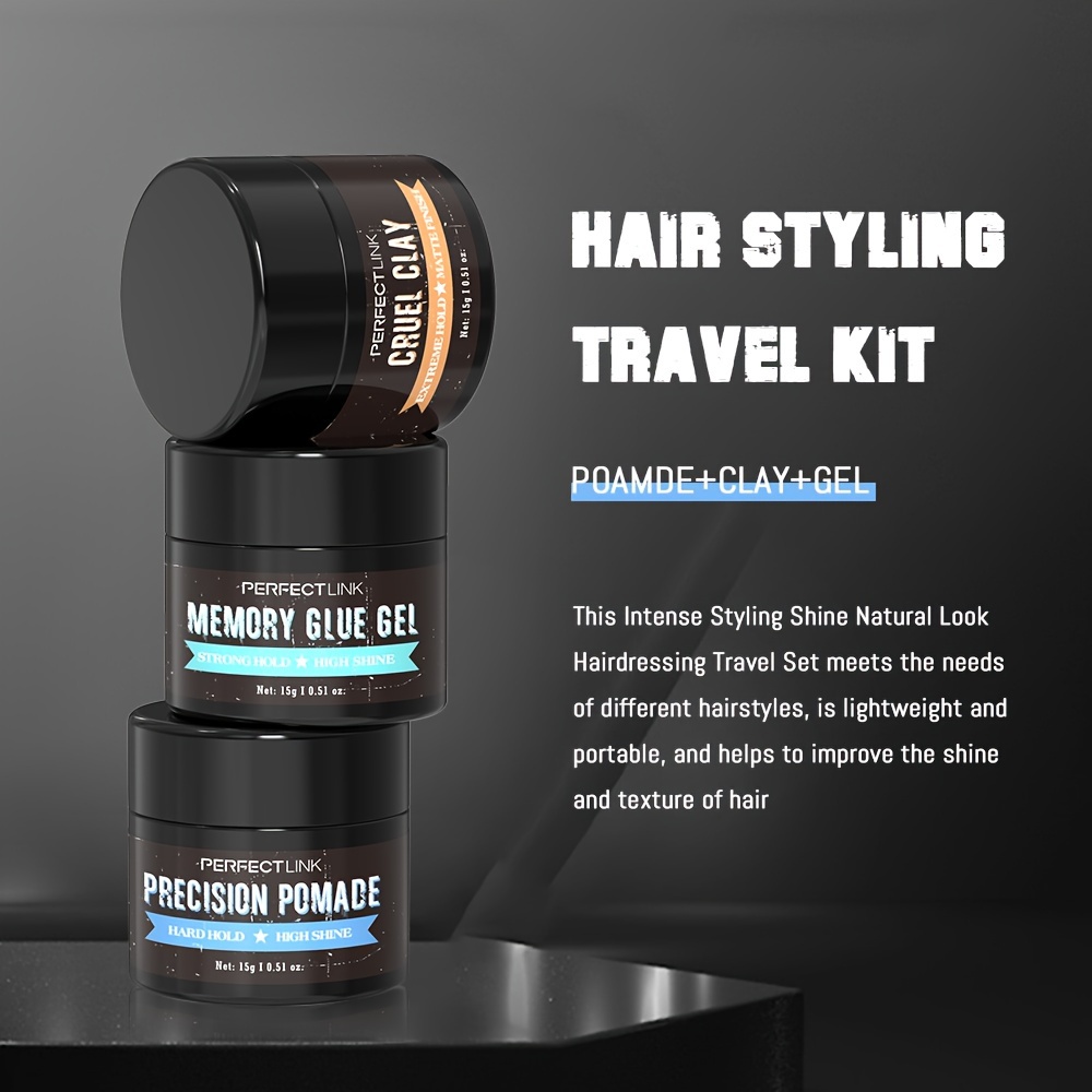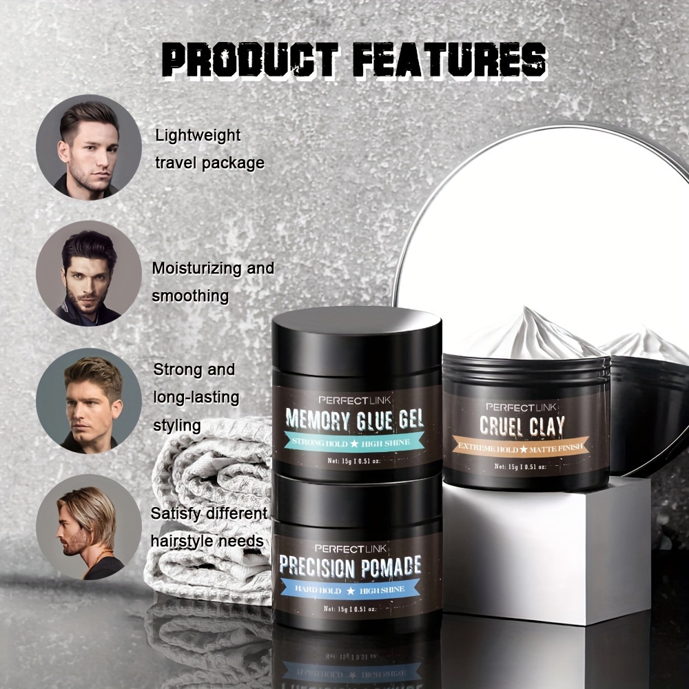 Perfectlink Men’s 3-in-1 Styling Kit: Precision Pomade, Memory Glue & Cruel Clay – Strong Hold, Long-Lasting, Moisturizing, Easy Wash, No White Residues – Ideal for All Hair Types, Hair Care Set