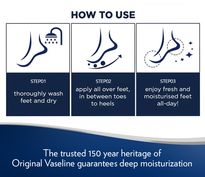 Introducing Vaseline Foot Cream, nourishing and soothing, it’s the perfect solution for dry cracked heels. This foot cream contains microdroplets of Vaseline Jelly® to help lock in an extra layer of hydration and offers rich moisturization to soothe extremely dry foot and heel. This foot cream is suitable for daily day and night use as its formula is fast-absorbing, non-greasy and non-sticky, leaving your feet and heels moisturized with a velvet-feel. You can also use it as a foot mask – after washing and drying feet, apply a generous layer of Vaseline Deep Moisture Foot Cream. Wear a pair of socks over your feet all night to lock in moisture.