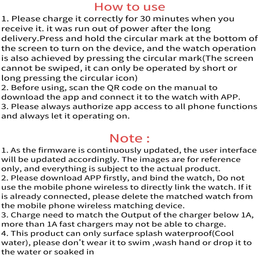 1. Please charge it correctly for 30 minutes when you receive it. it was run out of power after the long delivery.Press and hold the circular mark at the bottom of the screen to turn on the device, and the watch operation is also achieved by pressing the circular mark(The screen cannot be swiped, it can only be operated by short or long pressing the circular icon)
